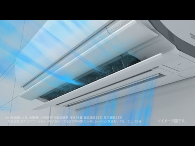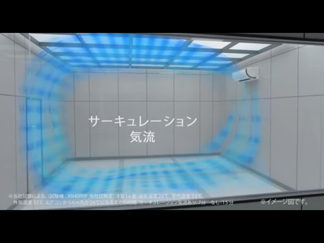 ※1 当社試験による。(試験機:AN40RRP 当社試験室:洋室14畳)設定温度26℃ 室内温度35℃ 外気温度35℃エアコンから6m先 が26℃になるまでの時間サーキュレーション気流あり:7分 なし:15分