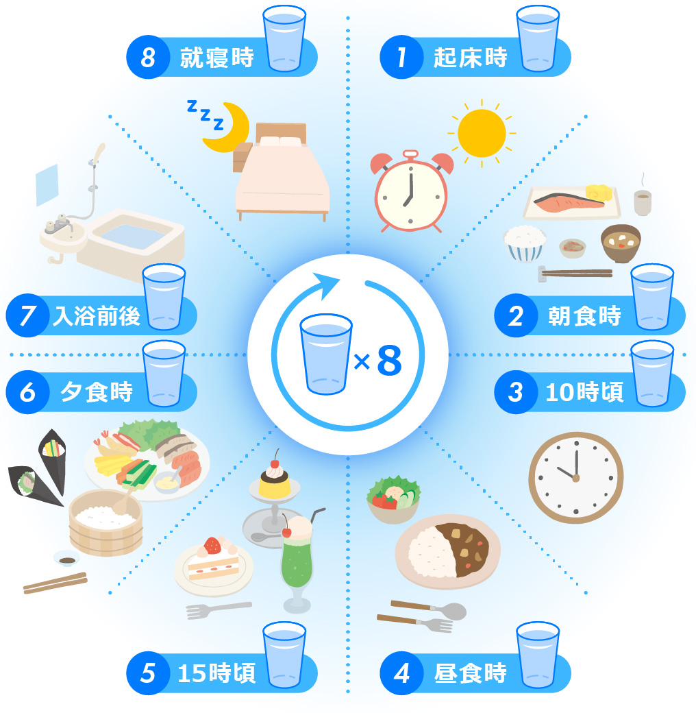 水の摂取時間の目安は、起床時、朝食時、10時頃、昼食時、15時頃、夕食時、入浴前後、就寝時です。