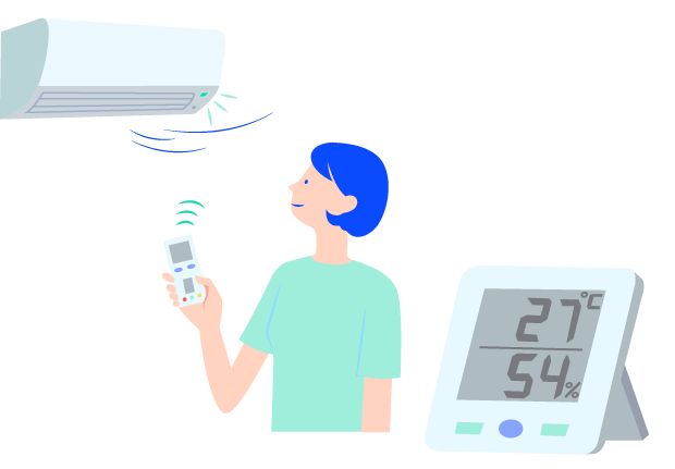 夏場の冷房時は、室温が28℃程度になるような設定温度で運転し、湿度調整もできるエアコンの場合には、湿度60%以下を目安に設定しましょう。室内の温度や湿度がどうなっているか分かるよう、見えるところに温湿度計を置いておくことも安心につながります。