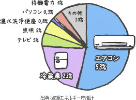 夏の日中(午後2時頃)の消費電力(全世帯平均)を見ると、エアコンは53%、続いて冷蔵庫が23%であり、圧倒的にエアコンによる消費電力が高いことがわかります。