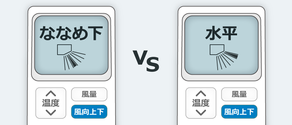 このような結果になる理由は、冷たい空気は重く、床付近にたまる性質があるからです。風向を「ななめ下」にすると床付近に冷たい空気がたまる一方で、天井付近には暖気がたまります。一般的なエアコンは、高い位置にある室内機内部の温度センサーで室温を判断します。天井に暖気がたまっていると、床付近が十分涼しくなっていても、エアコンはさらに部屋を涼しくしようと必要以上に運転してしまいます。風向を「水平」にすると、冷たい風が天井付近から床方向に自然に下りていくので、余計な電力消費を抑えながら、部屋全体を涼しくすることができます。