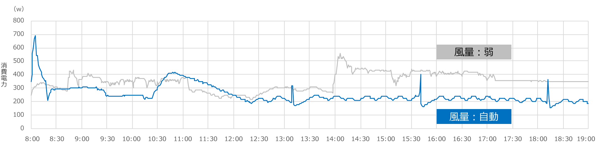 エアコン冷房の風量設定「弱」と「自動」それぞれで、日中11時間(8:00~19:00)つけっぱなしにして消費電力量を計測しました。