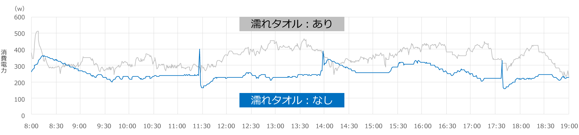 エアコンの室外機に濡れタオルを被せると節電になるかどうかを検証しました。室外機の上の濡れタオル「あり」と「なし」それぞれで、日中11時間(8:00~19:00)つけっぱなしにして消費電力量を計測しました。