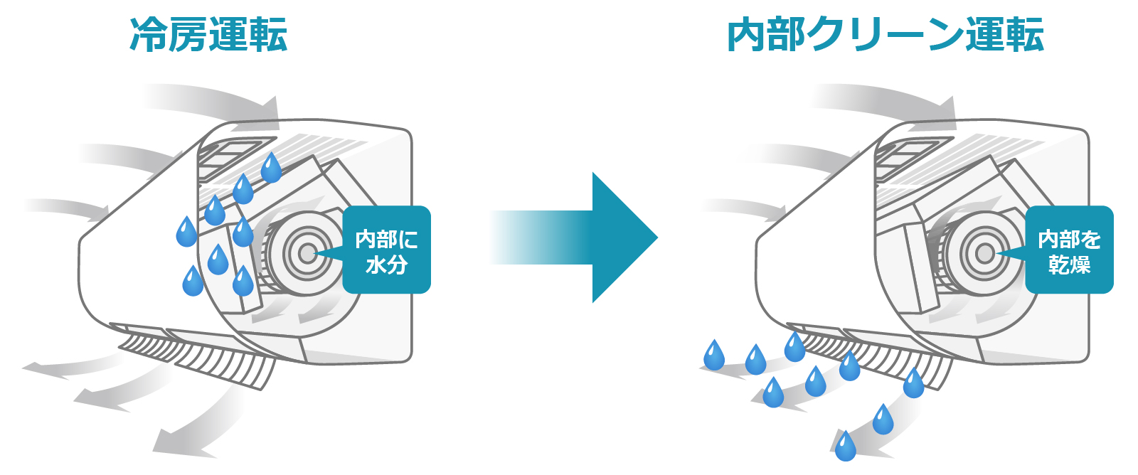 内部クリーン運転は、夏場の冷房運転や除湿運転( ドライ )によって室内機の中に発生した結露を乾燥させる機能です。夏場の冷房や除湿運転終了後に自動で運転するように設定して、運転が始まったら消さないようにしましょう。