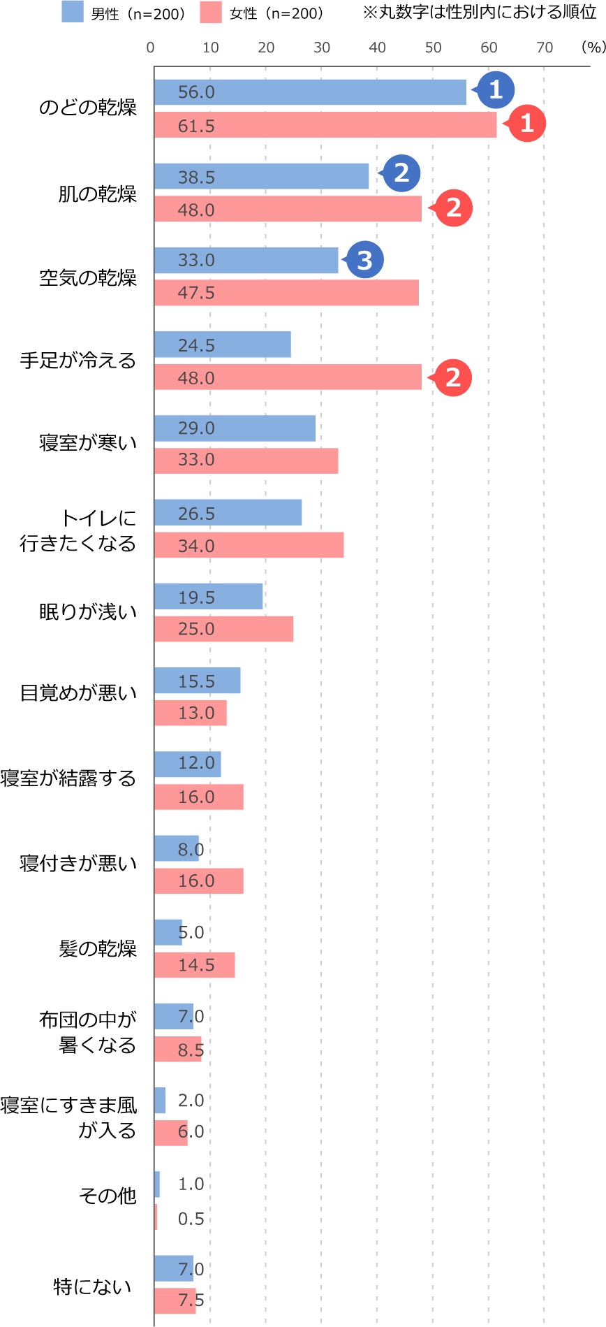 日本の冬は乾燥して寒い。そしてこれは寝室も同様です。冬の睡眠時に困っていることについて聞いたところ、男性で最も多かったのは「のどの乾燥」(56.0%)で、「肌の乾燥」(38.5%)、「空気の乾燥」(33.0%)が続きます。女性で最も多かったのは男性同様「のどの乾燥」(61.5%)でしたが、次に多かったのは「手足が冷える」「肌の乾燥」(48.0%)でした。「乾燥」「寒さ」は冬の睡眠時の二大困りごとといえそうです。