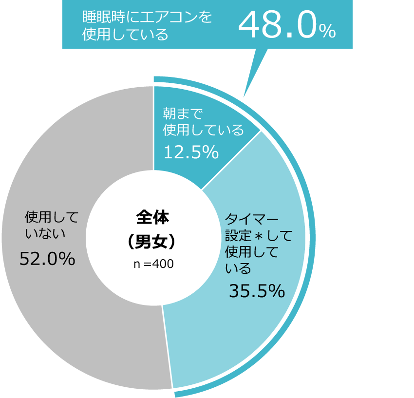 冬の睡眠時にエアコン暖房を使用しているか聞いたところ、約5割(48.0%)の人が睡眠時にエアコン暖房を使用していました。朝までつけっぱなしという人も12.5%おり、冬の睡眠時にエアコン暖房を使用することは、もはや珍しいことではなさそうです。