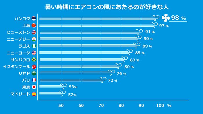 世界の人々に、「暑い時期にエアコンの風にあたるのが好きですか」と聞きました。空気と環境