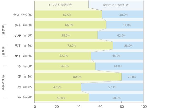 遊ぶ方が好き」(62.0%)と回答しており、「室内で遊ぶ方が好き」(38.0%)は4割弱に・・・ 全体をみる