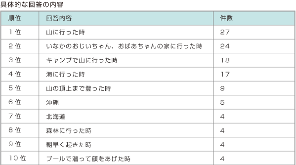 夏に空気がおいしいと感じたのは、どんな時、どんな場所、どんな状況だったのか、空気がおいしいと感じた時の経験をあげてもらいました。