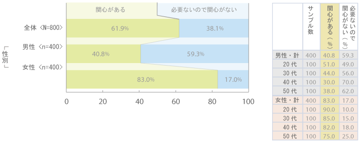 肌の乾燥対策に関心があるかを聞きました。「関心がある」(61.9%)が6割強を占めており、「必要ないので関心がな