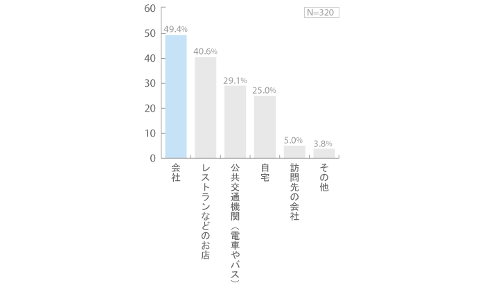 なったことがある場所を聞きました。半数弱が「会社」(49.4%)をあげており最も多くなっています。 ・・・