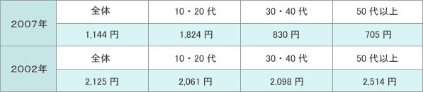 の全体の平均金額は2,125 円でしたが、2007年の平均金額は1,144円に下がっており、・・・