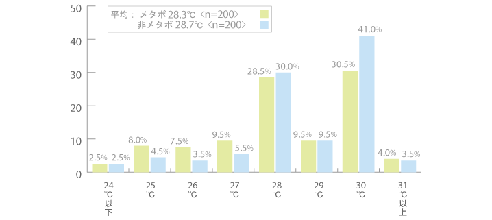 <メタボな人><メタボでない人>ともに最も多いのは「30℃」ですが、その割合は<メタボでない人>(41.0%)が<メタ