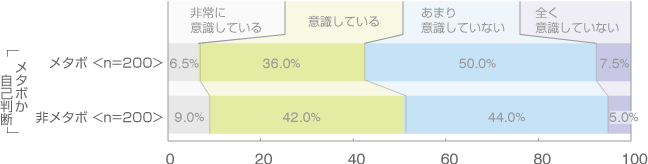 非常に意識している」「意識している」ともにメタボでない人(9.0%、42.0%)がメタボな人(6.5%、36.0%)を上回ってお