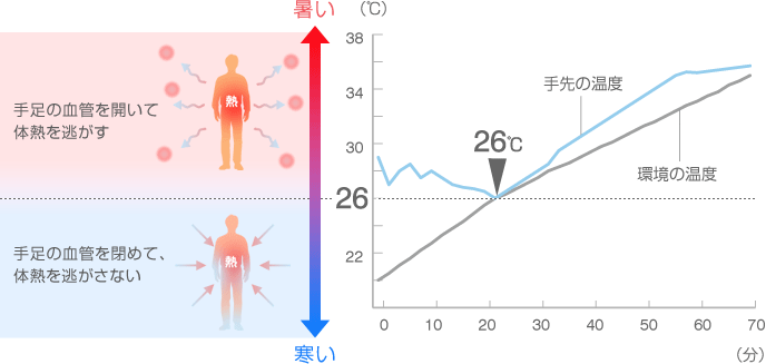 “約26℃”を境に、血管が開閉することを表したイメージグラフ