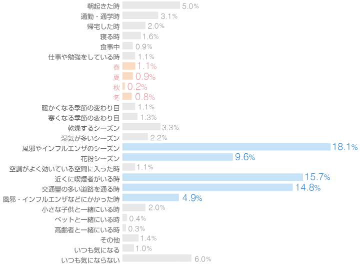 空気が気になる時は、1位「風邪・インフルエンザのシーズン」、2位「近くに喫煙者がいる時」、3位「交通量の多い道路を通