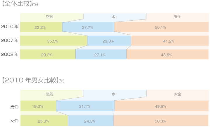 将来心配なのは? 1位「安全」、2位「水」、3位「空気」。でも、女性は「水」より「空気」が心配。