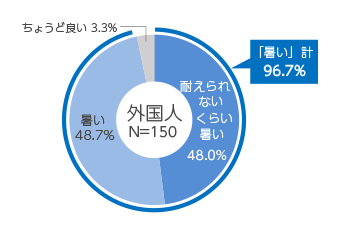 2018年は酷暑の夏となりましたが、外国人は東京の夏の暑さについてどう感じているのでしょうか。「あなたは東京の夏(屋外)の暑さをどう感じますか」と聞いたところ、ほぼ全員(96.7%)が「暑い」と回答しました。・・・ 全体をみる