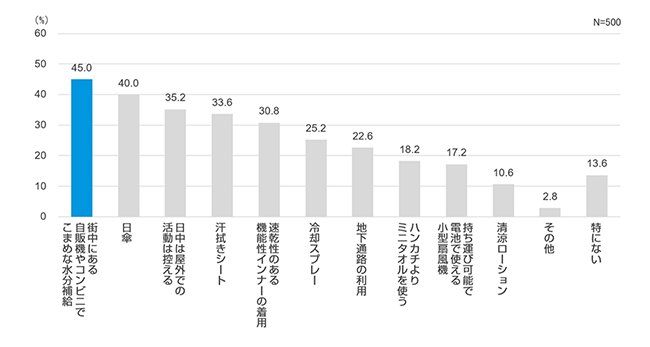 「自販機やコンビニでこまめな水分補給」「日傘」など日本ならではの暑さ対策がおすすめ。