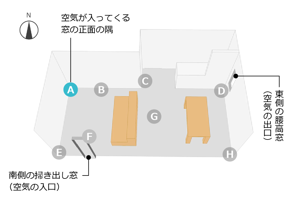 今回のシミュレーション条件では、南側の窓から入ってきた花粉は、気流に乗ってまず正面の壁にぶつかり、壁に沿って左右に広がっていきます。右に流れた花粉の多くは東側の窓から排出されますが、左側に流れた花粉は北西の隅に滞留します。「A」はこの隅に滞留した花粉を効率的にキャッチしたため、花粉の吸い込み量が多くなったと考えられます。