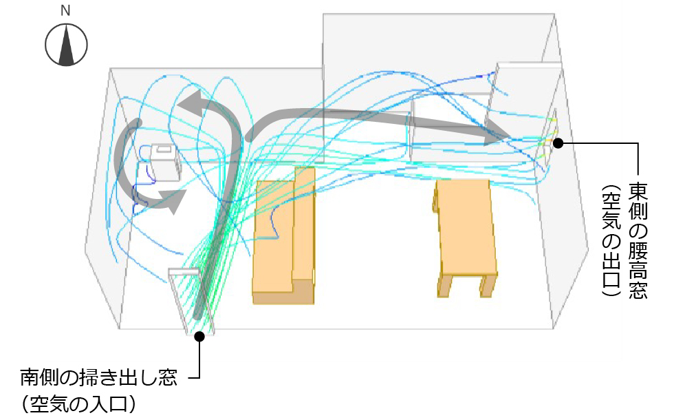 一般的な間取りのリビングで窓を開けて換気をした場合、入ってきた花粉がどのように動くのか、気流解析ソフトを使ったシミュレーションを行いました。