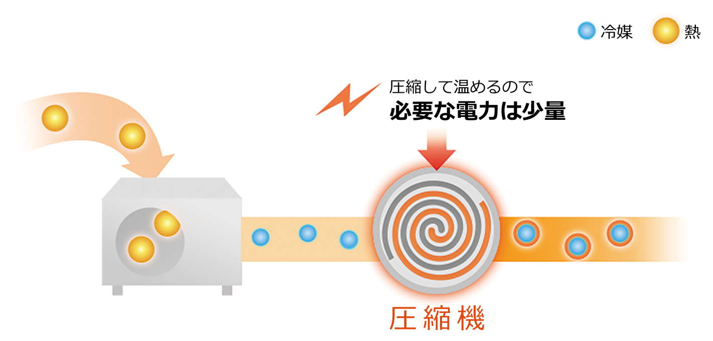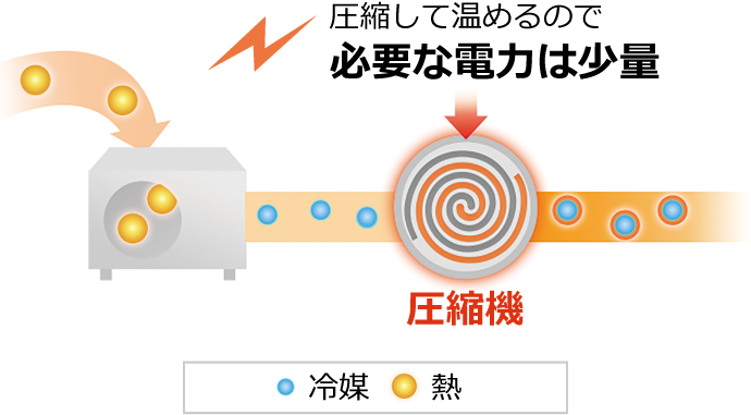 集めた「熱」を少量の電力で圧縮し、「冷媒」が「熱」を放出しやすい温度に調節します。