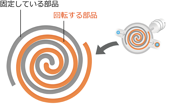 この渦巻きの片方がモーターの力で回転することにより、圧縮が行われます。
