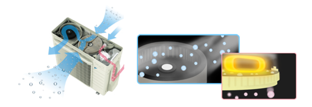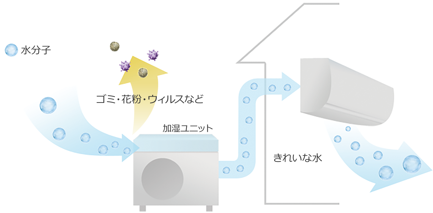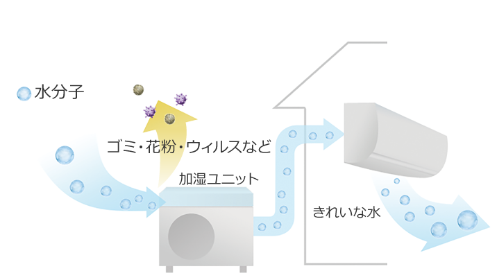 室外機が空気中にある水分子を集め、きれいな水だけを室内に送ります。だから給水なしでも加湿が可能です。