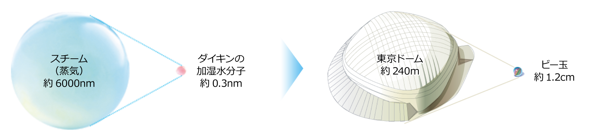 さらに、スチームの2万分の1(0.3nm)という超極小の水分子で加湿するので、お肌や髪の隙間まで潤います。