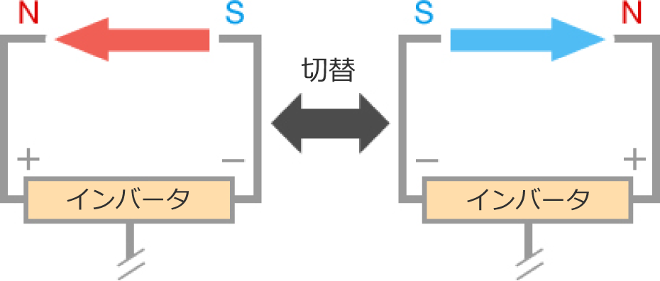 インバータは、モーターに送られる電流の向きの切り替えを行っています。