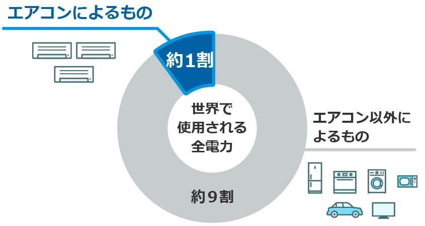 現在、世界で使用されている全電力の約1割はエアコンが消費していると言われています※8。その中には当然、ご家庭やビルで使用されている多くのダイキンのエアコンも含まれています。