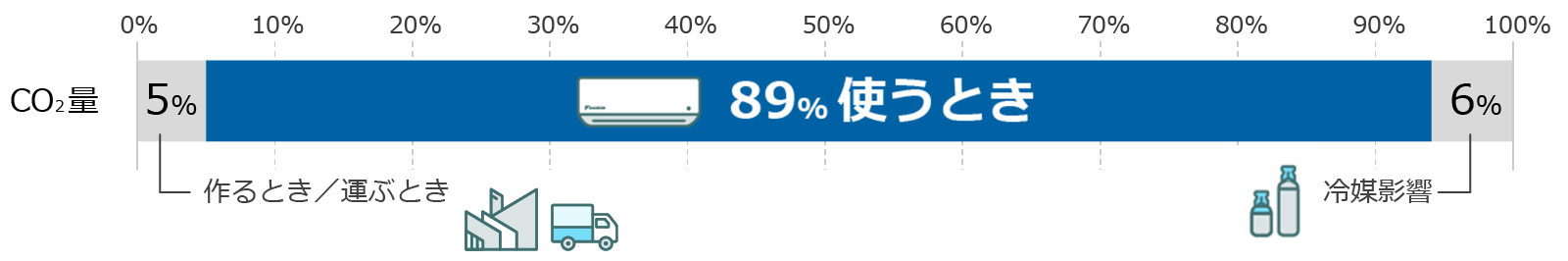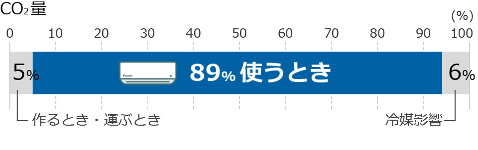 1台のエアコンが寿命を終えるまでに排出するCO2の総量は1台当たり3,692kg※10。ダイキンはメーカーの責任として、エアコンを作るとき・運ぶときの排出削減に取り組んでいます。一方で、排出総量のうち89%は「使うとき」に排出されるものです※10。そのため、「使うとき」に上手に省エネすることで、より多くのCO2削減につなげられる可能性があります。
