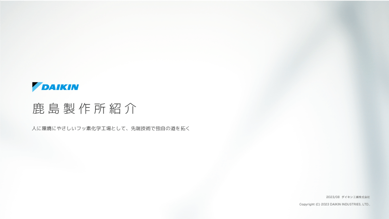 関東におけるダイキン化学事業の生産拠点として、フッ素樹脂及び化成品等を生産。徹底した安全管理体制のもと、高品質な製品の安定供給を実現しています。お客様のニーズに応えた製品をつくり、地域にも信頼される製作所を目指しています。