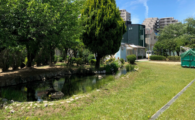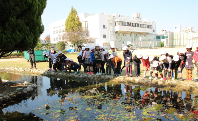 堺製作所の金岡工場では、敷地内に従業員の手作りでビオトープを造成し、緑化活動を推進しています。現在では、近隣の大泉緑地公園や大仙公園などの自然豊かな環境からチョウやトンボなどの昆虫類、鳥類などが訪れており、たくさんの生き物たちが生息しています。このビオトープは、地域小学生との交流イベントや、従業員の環境教育の場としても活用しており、工場と地域がともに自然と触れあい、学び合える場所となっています。