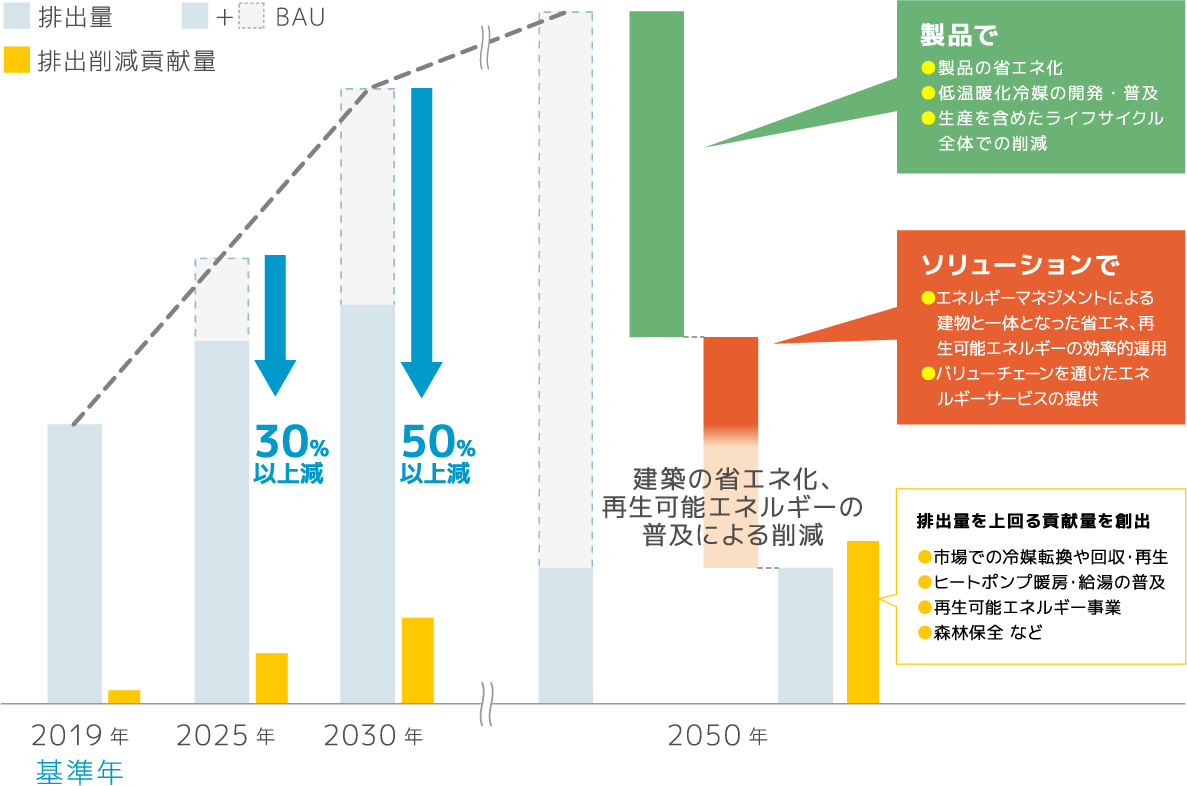 地球温暖化抑制に向けて大きな役割を担っているダイキンは、2019年を基準年とし、未対策のまま事業成長した場合の排出量と比べた実質排出量を、2030年に50%以下、2050年に実質排出ゼロを目指すというカーボンニュートラルの取り組みを進めています。