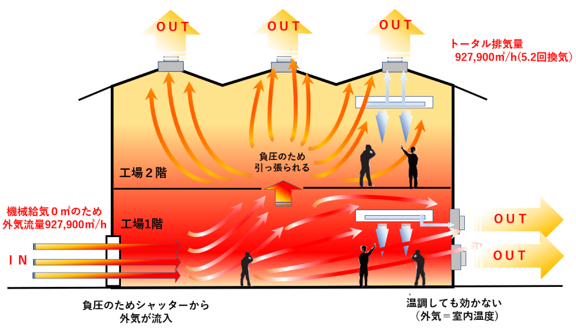 既存工場の陽圧化及び給排気バランス改善。産業プロセスの燃焼設備をヒートポンプ式に置き換え。