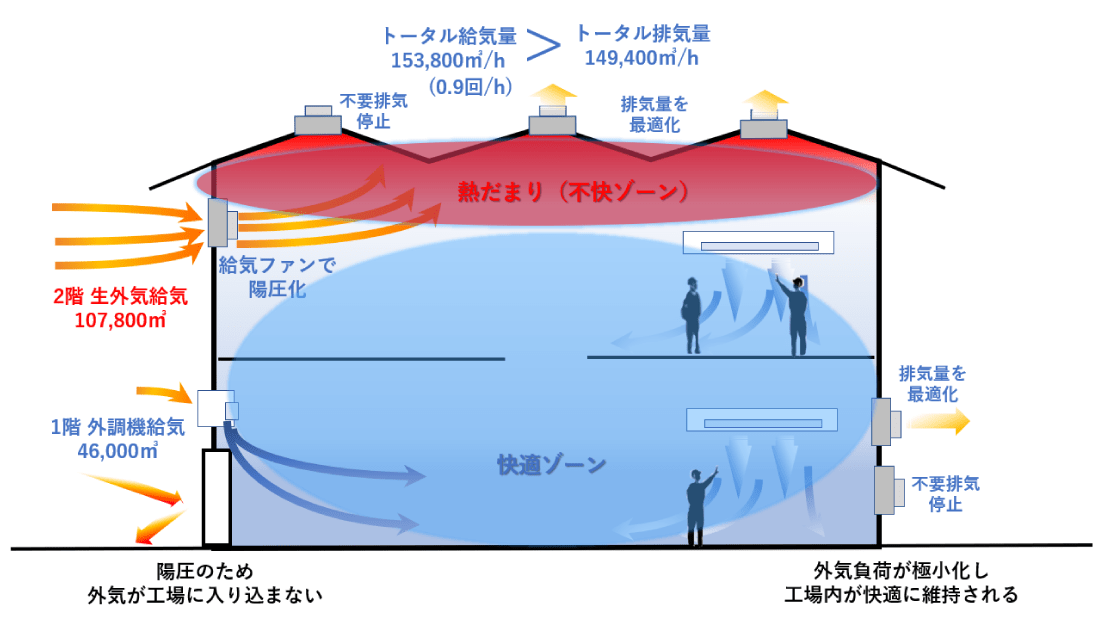 臨海2号工場では、給排気量の最適化により工場空間を陽圧化することで、外気の過剰な流入を抑え夏場と冬場の工場内の温度をそれぞれ6℃以上改善しました。