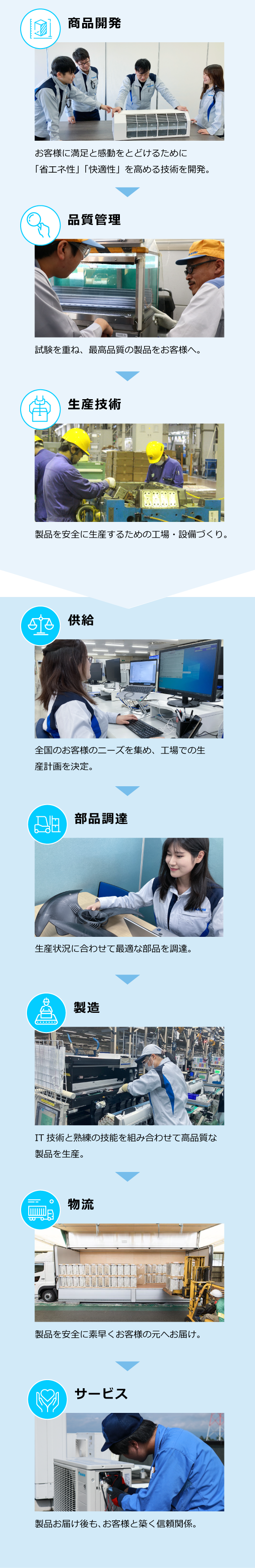 部品の設計・生産・調達から商品の開発・生産・供給まで、従業員が一体となって商品づくりに取り組んでいます。