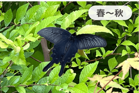 その中でもジャコウアゲハの幼虫は、淀川の河川敷に自生するウマノスズクサしか食べない希少な昆虫です。ウマノスズクサは TIC の森に植栽していないにも関わらず、風や野鳥の糞で運ばれた種が発芽し、自生しています。そのウマノスズクサを目指して淀川水系からジャコウアゲハが訪れています。また、春は満開のヤマザクラ、夏はせせらぎへのホタルの飛翔、秋は紅葉、冬はクヌギ・コナラの冬枯れなど、四季折々の自然を楽しめる場となっています。