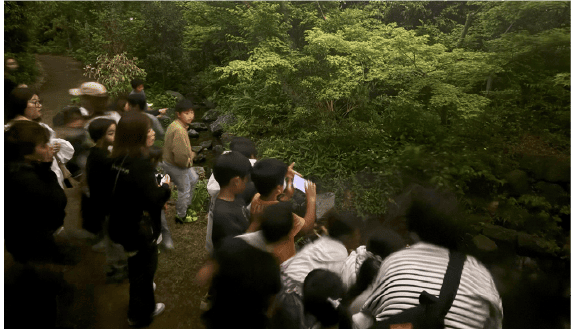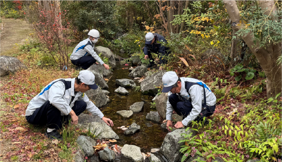 2017年から、TICの森のせせらぎでホタルが生息できる環境づくりに取組んでいます。ホタルの幼虫の餌となるカワニナ(巻貝)は、綺麗な水でなければ育ちません。そのため、従業員が自ら落ち葉や藻の除去、木の植え替えなどを行い、水質や産卵環境を整備。カワニナの自生を支え、ホタルが自然に定着できる環境づくりを進めています。