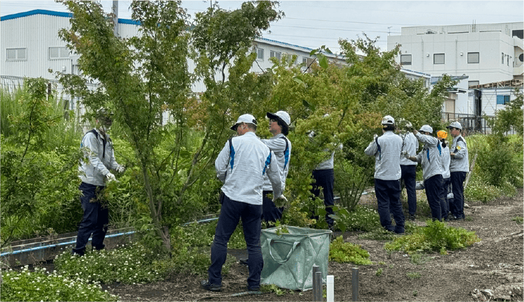 TICの森で育ったイロハモミジの苗を、製作所内の各事業部で育苗し、持ち寄って移植することで、製作所の敷地全体の緑化をすすめています。従業員の環境意識を高めるとともに、共同で植樹を行うことで、事業部間での交流を深めることにつながっています。植樹後は年に1回、所内の環境取り組みに関わる従業員が剪定・間引きを行い、保全活動を継続して実施しています。