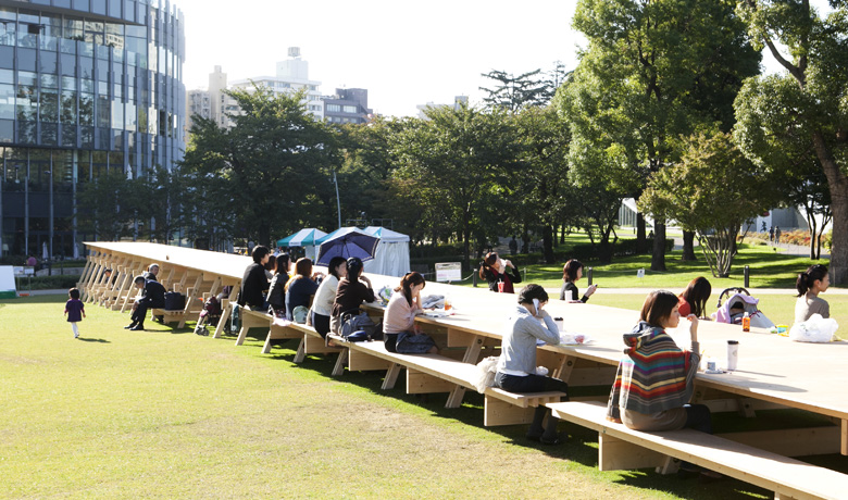 これは、東京ミッドタウンの広い芝生広場にイベントに合わせて設置した『ガリバーテーブル』というものです。50メートルもある一直線の長いテーブルで、手前は高さが2メートルくらいあって、先端のほうはかなり低くなっているのですが、実はテーブル自体はフラットなんです。