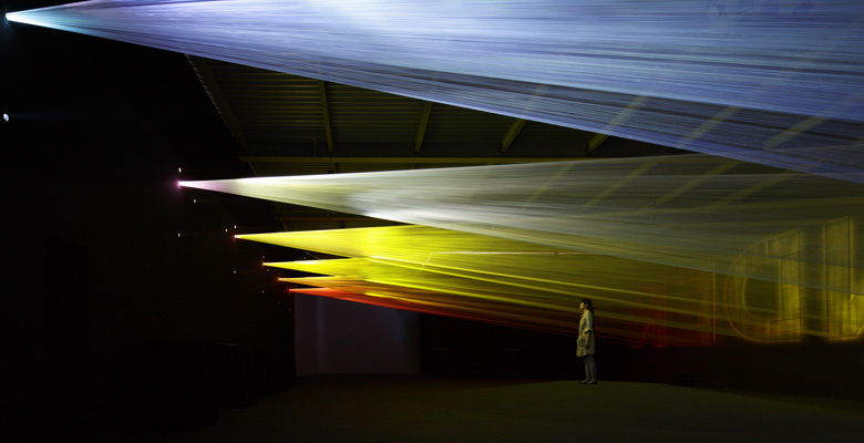 トラフ建築設計事務所の可視化のアイデアは、空気だけでなく、空気を貫いていく光にも及んでいます。それが2011年「ミラノサローネ」キヤノンの展示会場での『光の織機』です。