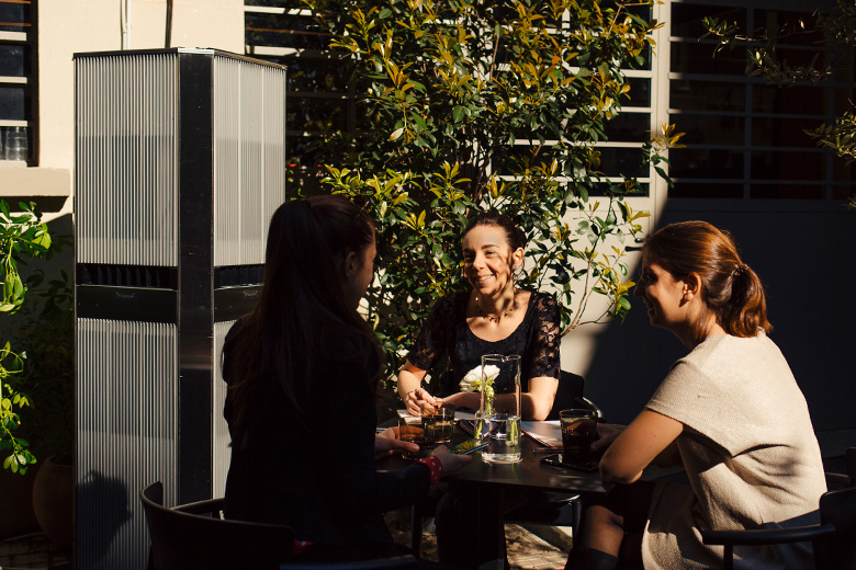 従来の屋外の暑さ対策でよく使用されるミストシャワーや気化式の冷風機は、日本の夏の様な湿度が高い環境下で清涼感が得にくい課題があります。さらにミストシャワーの水分は女性のメイクや髪を崩すので敬遠されたり、衛生面から飲食店では使用できない等の課題もありました。対してアウタータワーは除湿した乾いた冷風を届ける事で爽やかな涼感を得ることができ、水分を含まない分、衛生面の問題も無く、飲食店など様々な場所に設置して頂けます。