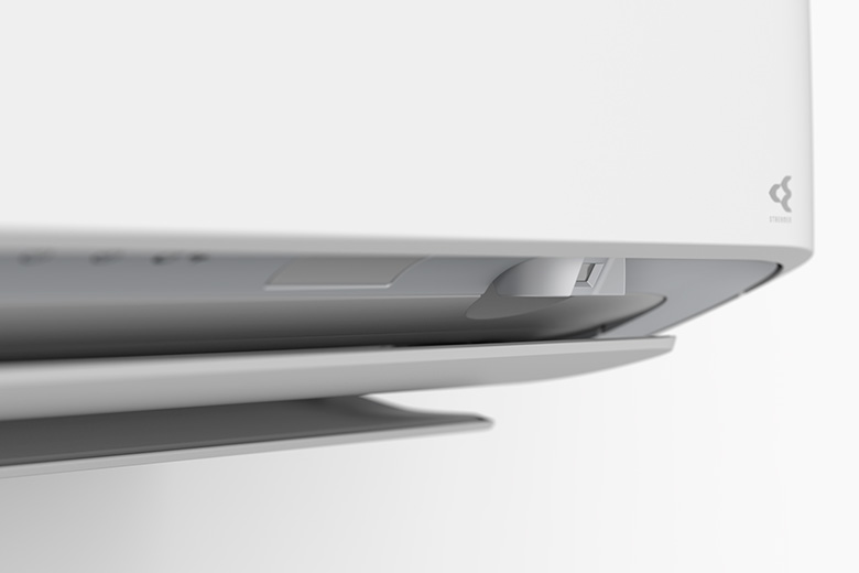 今回、私たちが空調における最も重要な機能部品として捉えたのが空気を操るフラップです。通常、エアコンは停止時にフラップが筐体にきれいに収まる構造が一般的ですが、今回我々はフラップの周りを囲むラウンドパーツを設けました。フラップを筐体の形状から分断させることで、繊細な気流制御を可能にし、かつ運転時と停止時のアピアランスの変化を抑えました。