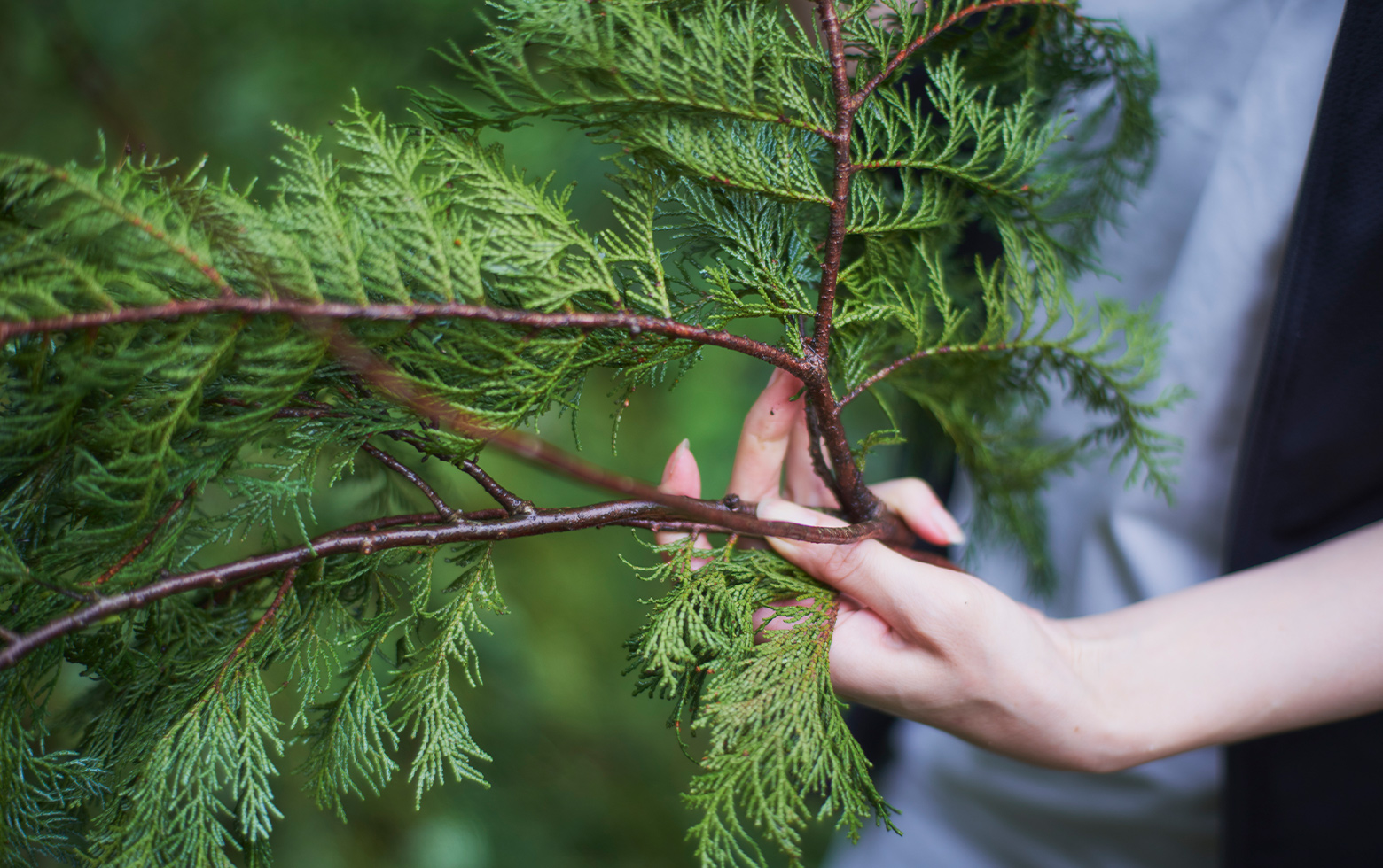 植物にはフィトンチッド(phytoncide)という化学成分が含まれているそうなんですね。植物が刺激を受けた時に、自分自身を守るために発する殺菌成分のある揮発性物質です。森に入ると「森のいい匂い」と感じることがありますが、それがフィトンチッドの匂いなのです。人間にとってもリラックス効果があり、免疫機能を高めたり、殺菌効果があることも証明されているそうです。そのことを思い出し、フィトンチッドがたっぷり含まれた枝葉を束ねたタリスマンを、東京でステイホーム中の友人たちに贈ることにしたのです。ちょうど4月から5月頃、コロナ禍が深刻化して、消毒用のアルコールやマスクが手に入りづらかった時期でした。都市で移動や外出を制限されてストレスが溜まる生活の中に、少しでも森の気を届けることができたらと思ったのです。