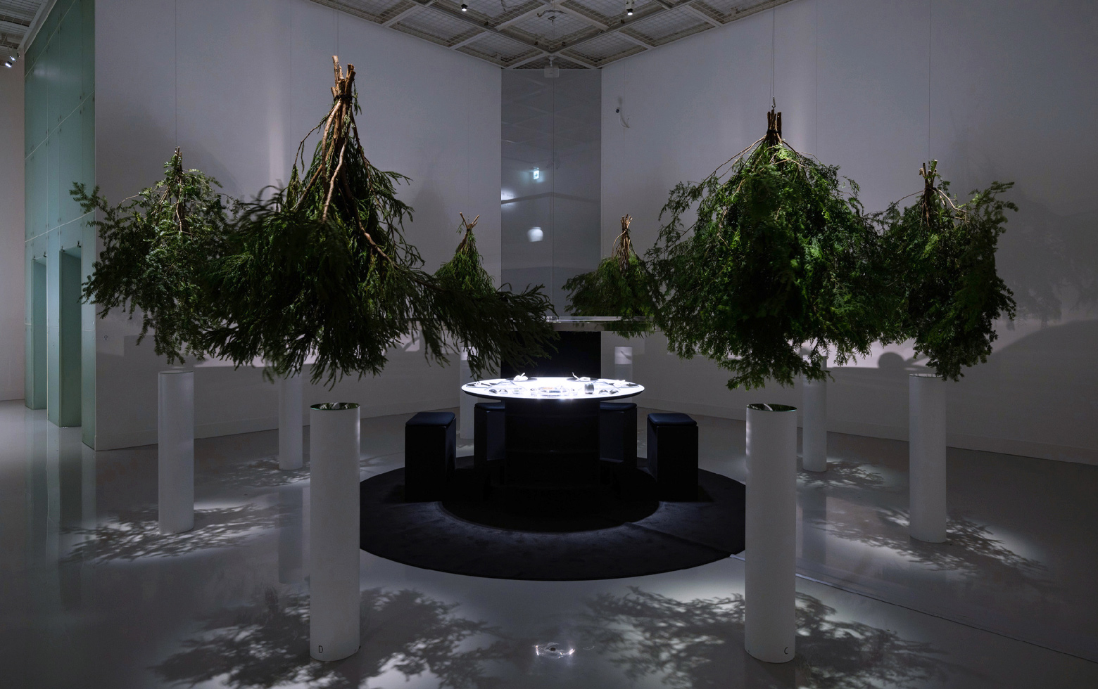 再開にあたって、資生堂ギャラリーにも森からタリスマンを運びました。ギャラリーを訪れる方たちは、マスクをしてストレスを感じながら、感染のリスクもある中でわざわざ出掛けて来てくれるのですから、森のフィトンチッドをタリスマンにしてギャラリーの中を満たし、ある意味で魔除けであり浄化する空間にしたかったのです。銀座に森をつくり、作品を体験することで、自然の力によるバリア機能を高められるようにしたいと思ったのです。