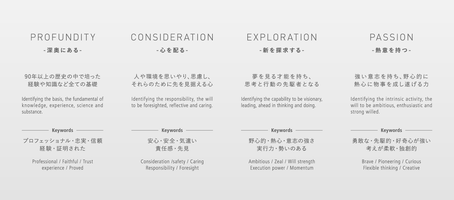 これはダイキン工業という会社の個性をそのまま凝縮したようなものです。ヨーロッパやアジアへとグローバル展開を志向する中で、私たちがデザインポリシーを共通認識化するために、ダイキン工業とはどういう会社なのか、改めて整理し、コアを見つめ直して具体的な言葉に置き換えたのです。
