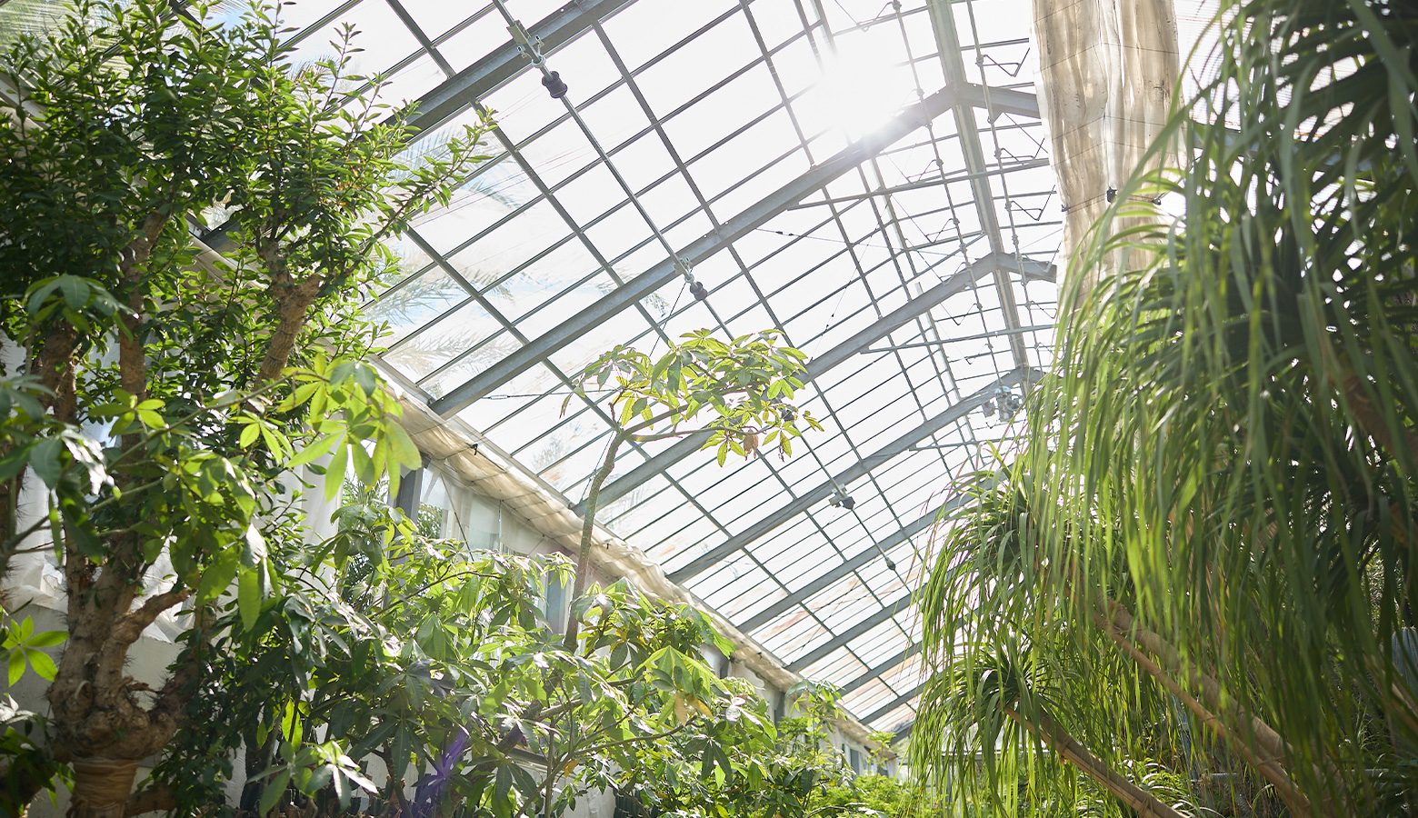 温室というと、冬の寒さから植物を守るイメージがあるのではないでしょうか。それはもちろん必要ですが、夏の暑さや紫外線から守ってあげる役割もあります。熱帯植物とはいえ、30℃を超えると、その多くは成長を止めてしまいます。人間と一緒で20℃~25℃くらいが一番心地よく、成長するのに適していて、夏場は温室の周りに木陰をつくる植物を置いてあげたり、天窓を開けて熱を持った空気を逃がしてあげます。そうすると放射冷却によって温室内は外部より涼しくなる。植物自体の力も利用しながら、心地よい空気をつくり出すのです。