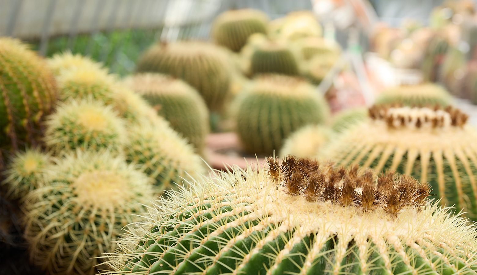 サボテン専門の温室はちょっと変わっています。サボテンという植物はとてもユニークで、目が付いているわけでもないのに、頭上にどれぐらいの高さの天井があるかわかるんです。天井が低いとあまり背を高くしようとせず、丸く締まった形になる。そのぼってりとしたフォルムが値打ちがあるため、サボテン用の温室は天井が低く、小さくなっています。小さな温室は急に温度が上がったり、日が落ちるとすぐに寒くなるのですが、そういう環境はサボテンが育つ乾燥地帯の気候とすごく似ていて、理に適っているのです。